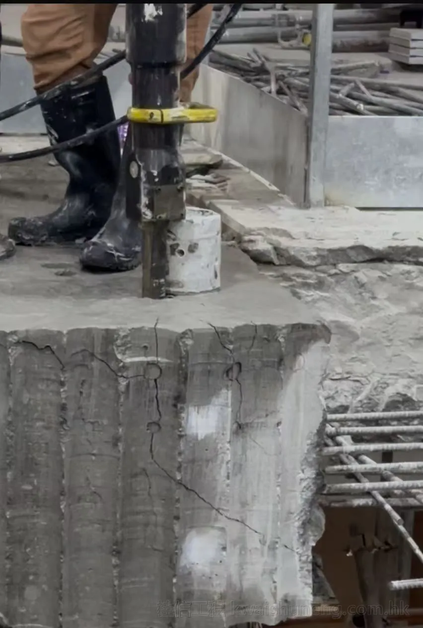 專為大型及厚身混凝土構件設計的靜音拆卸技術,將液壓頂置於預鑽孔內以高壓逼裂構件,無噪音、無震動,可用於密閉空間及水底作業。